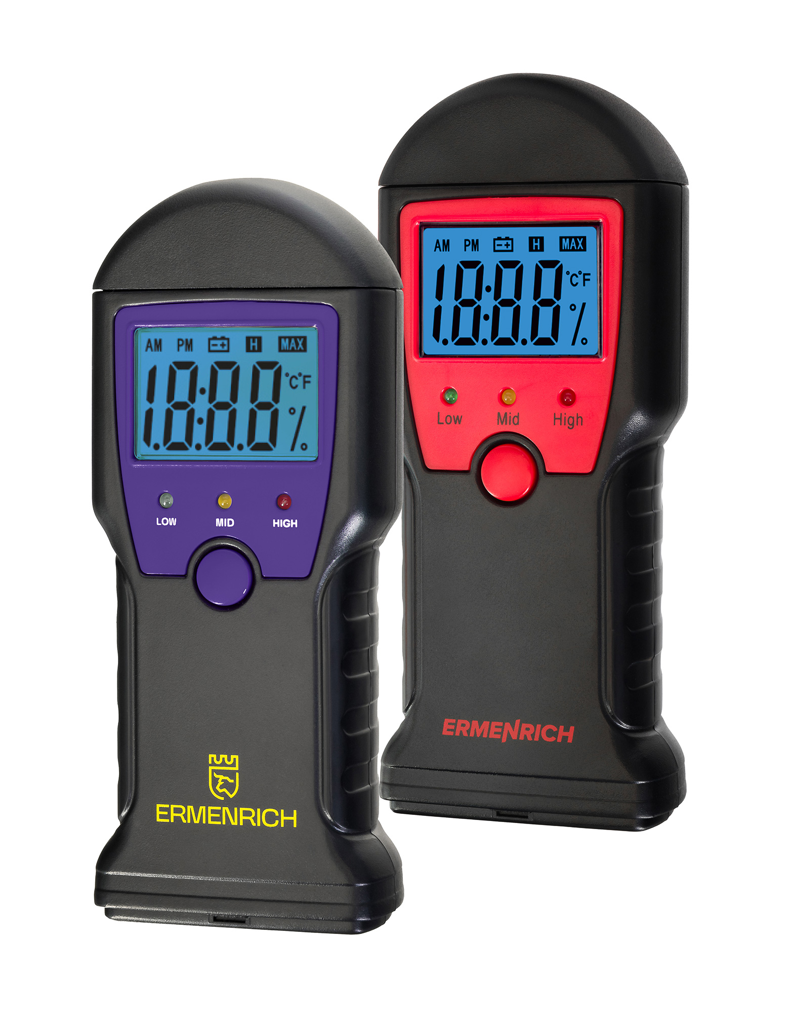 Ermenrich Wett MW10 е детектор за влага с щифтове за определяне на съдържанието на влага в дърво, строителни смеси и разтвори. Устройството може също така да измерва температура в Целзий или Фаренхайт. Лесно управление с един бутон. Измерванията се показват на вградения екран с големи цифри и ярка синя подсветка. Под екрана има три светодиодни индикатора, които дават обща оценка за това колко влага има в материала: зелено означава ниска, жълто означава повишена, а червено означава висока.