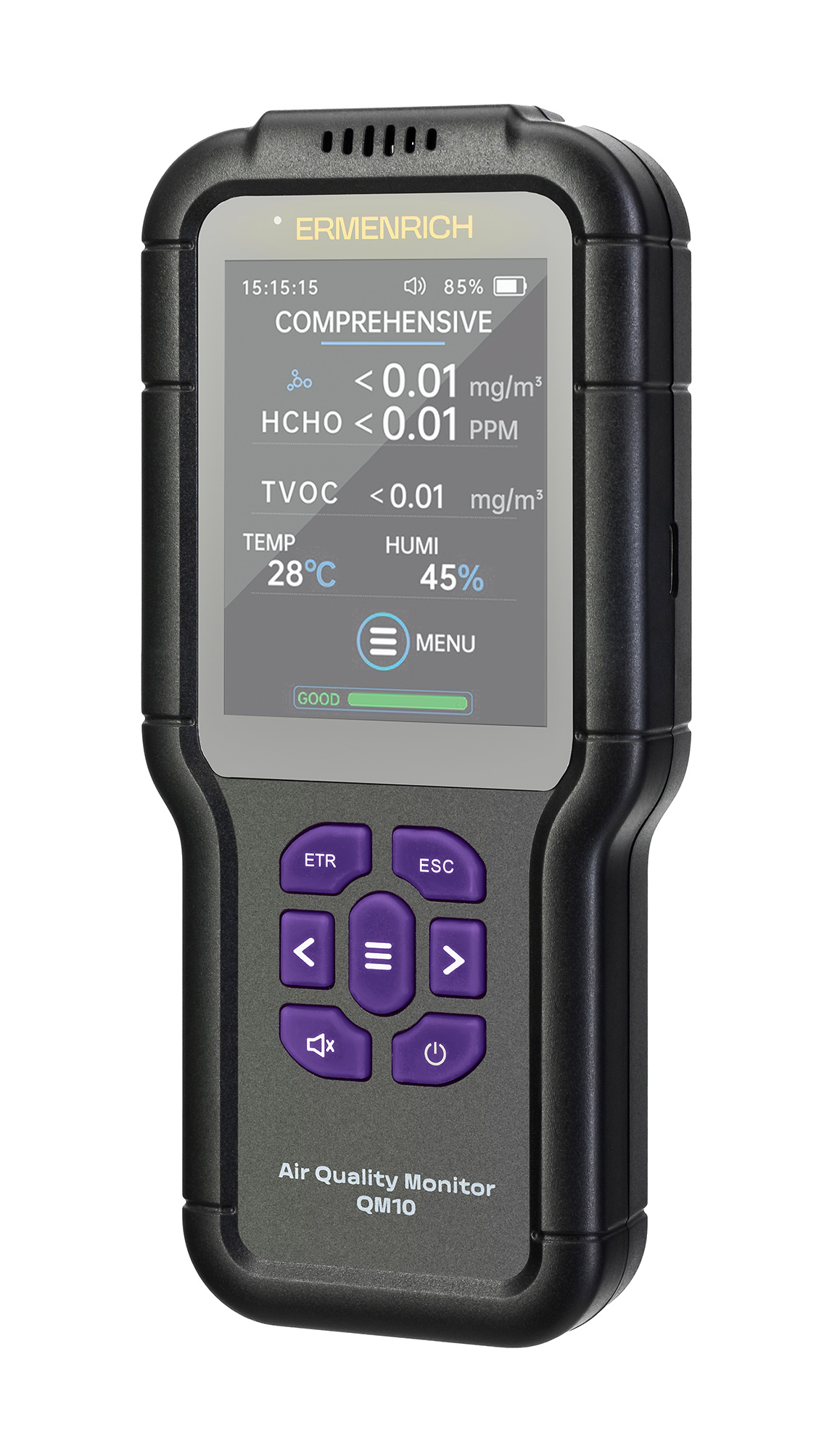 Мониторът за качество на въздуха Ermenrich QM10 е ръчнопреносим инструмент за анализиране на състава на въздуха на закрито, откриване на повишени нива на вредни субстанции и мониториране на микроклимата. Може да се използва в домашни и търговски среди – офиси, хотели, училища и детски градини, кафенета, магазини и т.н., но не и за индустриални цели – диапазонът на измерване за TVOC (летливи органични съединения) е 0,0–10,0 mg/m3, което не е достатъчно за откриване на по-високите концентрации, които често се срещат в индустриалните среди.