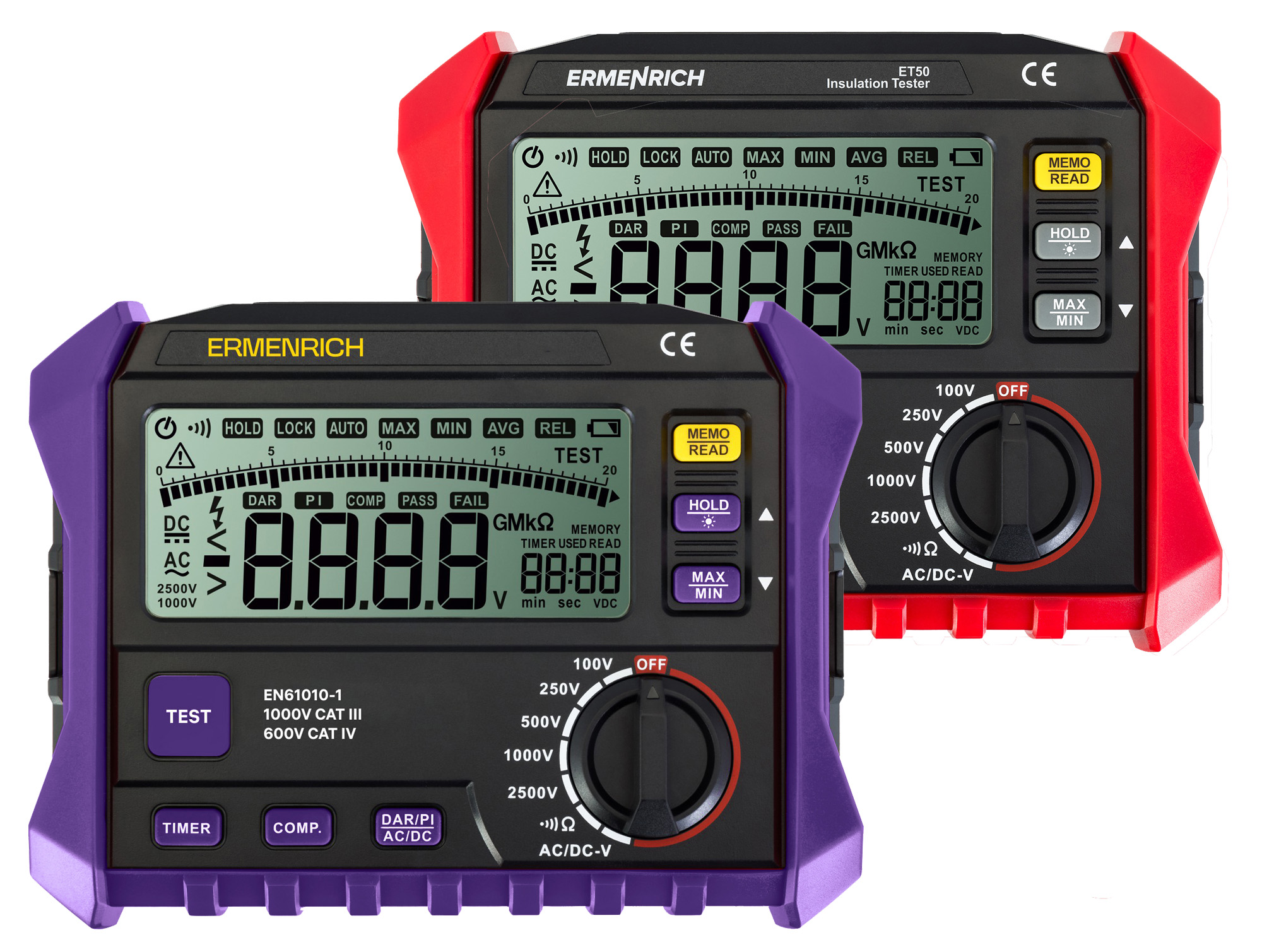 Ermenrich Ping ET50 е уред за измерване на изолационното съпротивление или мегаомметър, който се използва за проверка на качеството на кабелите. Повреждането или влошаването на изолацията на кабели под напрежение може да доведе до късо съединение и пожар. Редовните проверки с мегаомметър намаляват риска от възникване на такива опасни ситуации. Уредът работи с 5 тестови напрежения: 100, 250, 500, 1000 и 2500 V. Общият диапазон на измерване на съпротивление е от 0 до 200 GΩ.
