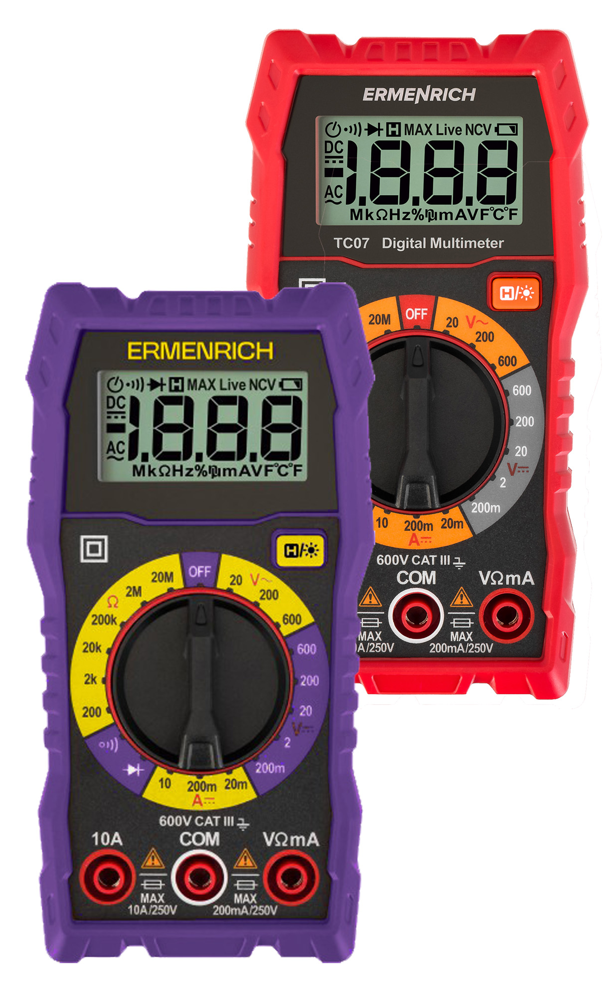 Мултиметърът Ermenrich Zing TC07 с класически въртящ се превключвател е предназначен за измерване на постоянно и променливо напрежение, постоянен ток и съпротивление. Функционалните му възможности са достатъчни за изпълнение на повечето задачи у дома, както и за извършване на основни измервания в работата на професионален електротехник.