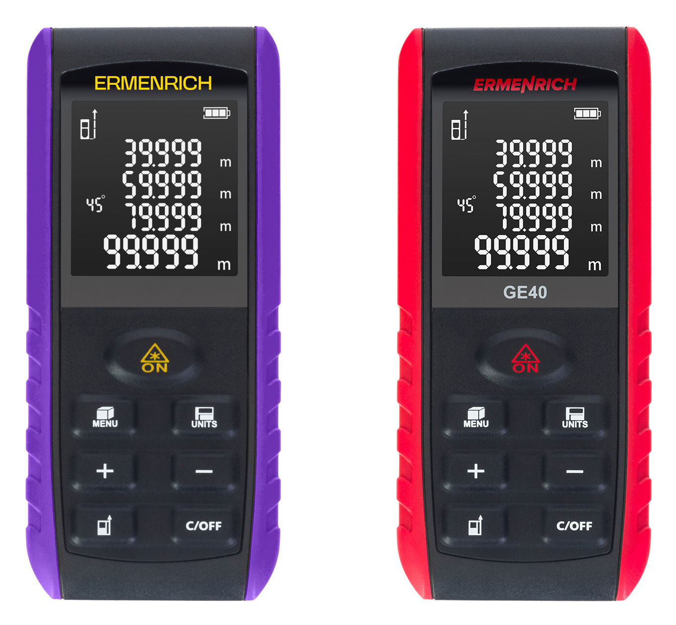 Лазерният измерител Ermenrich Reel PRO GE40 е практичен, многофункционален инструмент за строителни, ремонтни, монтажни и проектно-конструкторски работи. С него могат да се измерва разстояния до 40 метра, както и да се изчисляват площ, обем и ъгли. Когато трябва да се извършват измервания при трудни условия, функцията с използване на Питагоровата теорема ще Ви помогне да изчислите разстоянието с помощта на междинни измервания.