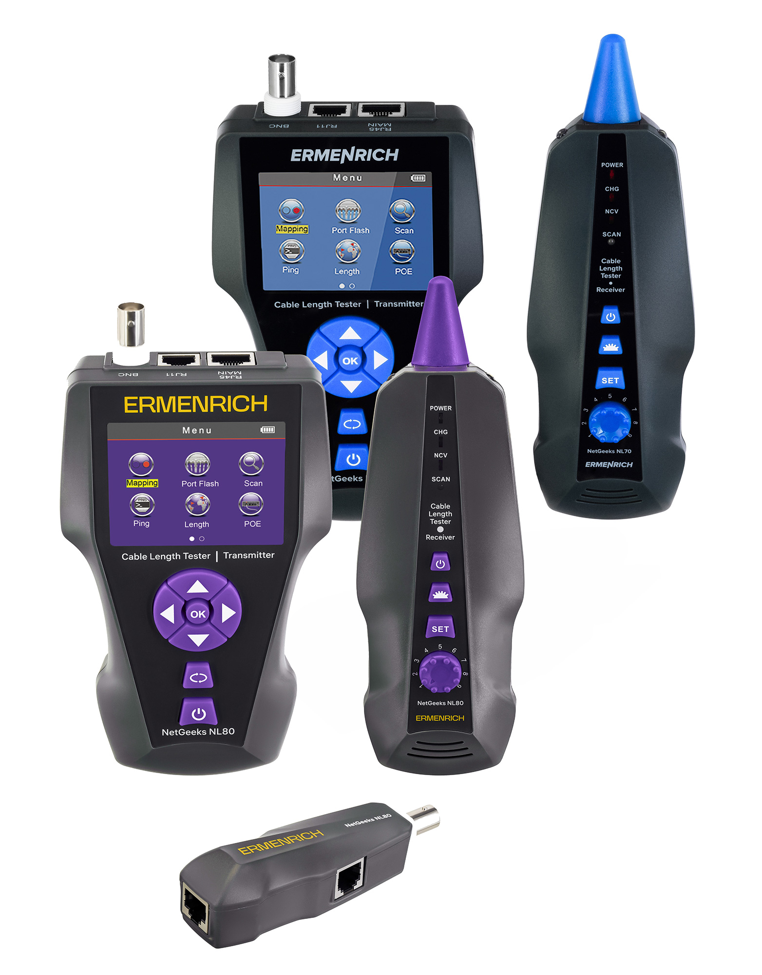 Тестерът за дължината на кабели Ermenrich NetGeeks NL80 може да измерва дължини на кабели до 1000 метра, също има и други характеристики. Той може да проверява кабели за прекъсвания и къси съединения, така също разделени, кръстосани и обърнати двойки. Може да измерва също разстоянието до места на прекъсвания и къси съединения. Ermenrich NetGeeks NL80 може да проследява кабели, да открива кабели, свързани към маршрутизатор или комутатор сред много други, да извършва PoE и PING тестове и да записва резултатите на карта с памет.